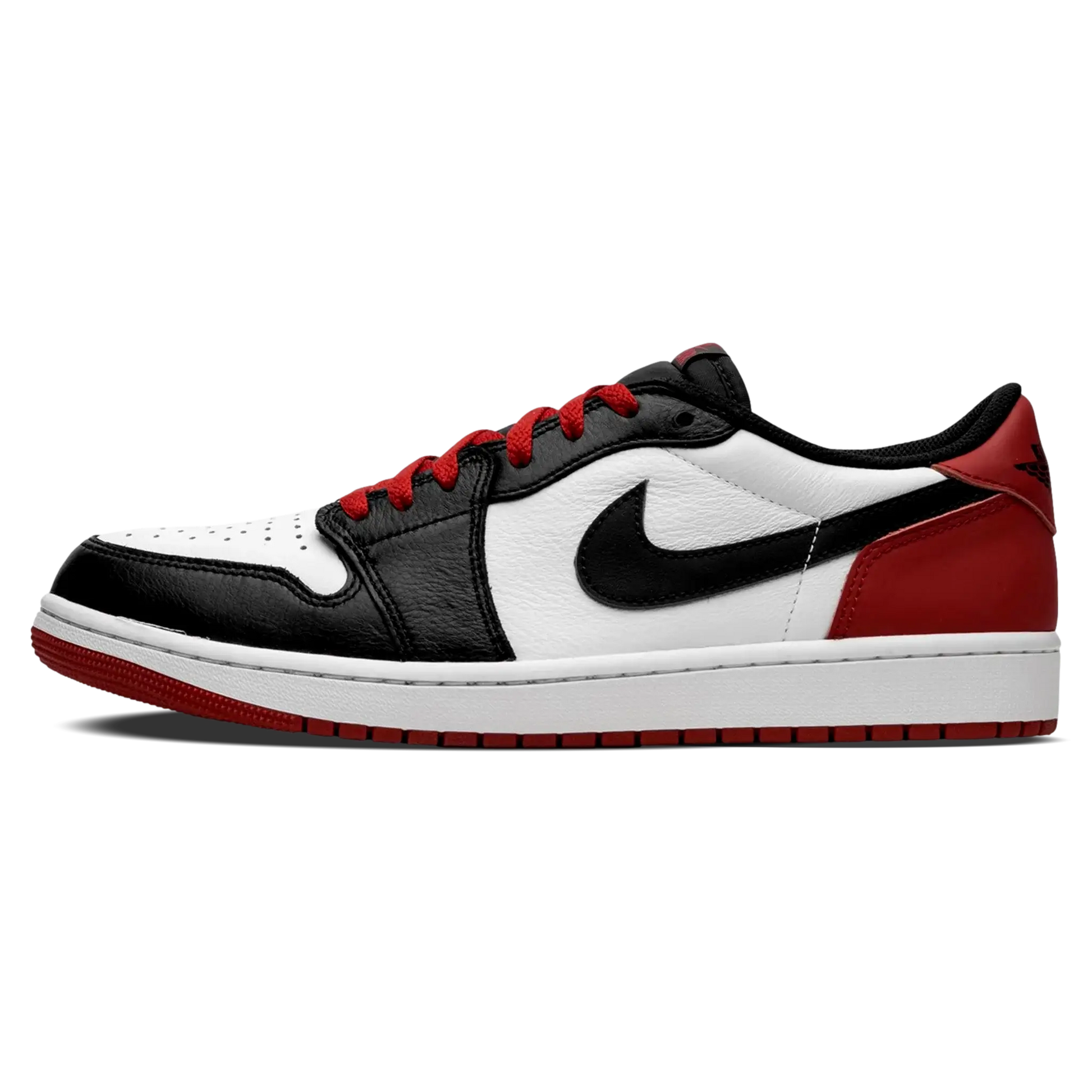 - Cores clássicas: um Jordan Low preto e vermelho com cores clássicas do Air Jordan 1 High Black Toe de 2016.