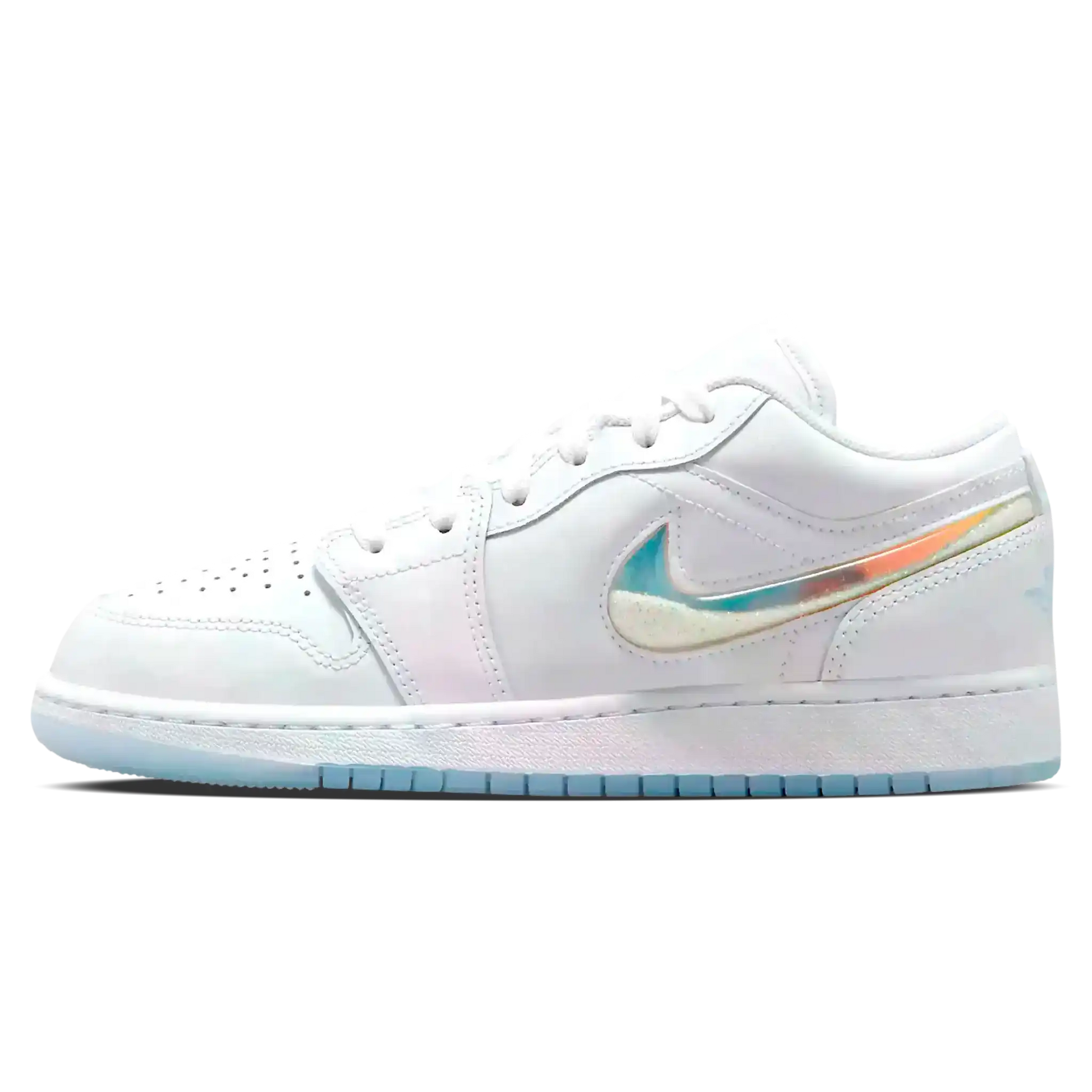 O Air Jordan 1 Low Feminino "Glitter Swoosh" Branco tem a temática perfeita para o inverno, o tênis é composto por um cabedal branco clean, que é complementado pela entressola na mesma cor, e por uma sola de borracha translúcida, dando um toque gelado para o tênis.