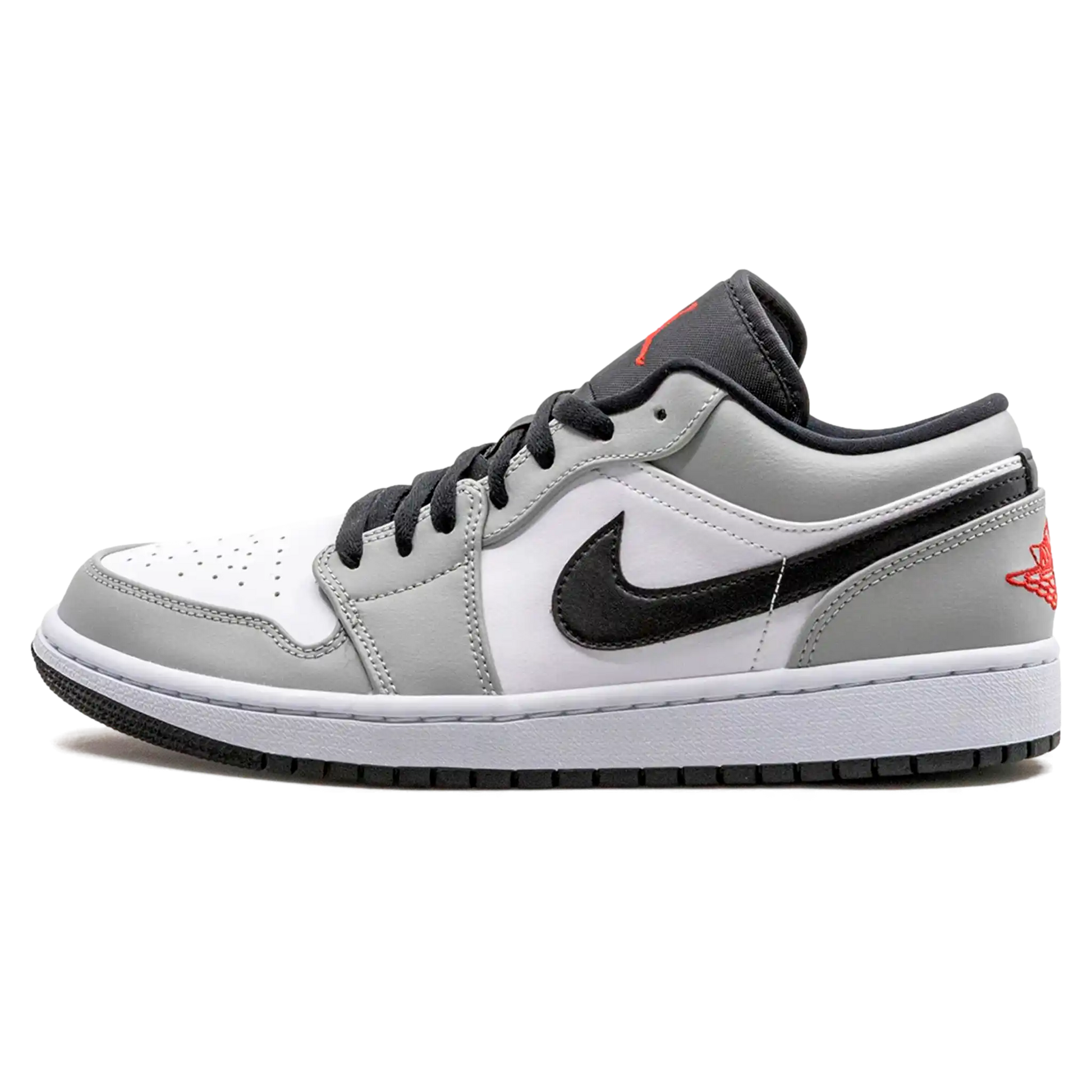 O Air Jordan 1 Low "Light Smoke Grey" apresenta uma paleta de tons neutros, com couro branco e sobreposições revestidas em cinza. Esses tons predominam no tênis, complementados por Swooshes, línguas e forros em preto profundo. Detalhes em vermelho, transferidos do modelo de cano alto, são incorporados por meio de marcações bordadas nos calcanhares e nas línguas, adicionando um toque de cor. Esta versão proporciona uma estética sofisticada e versátil.