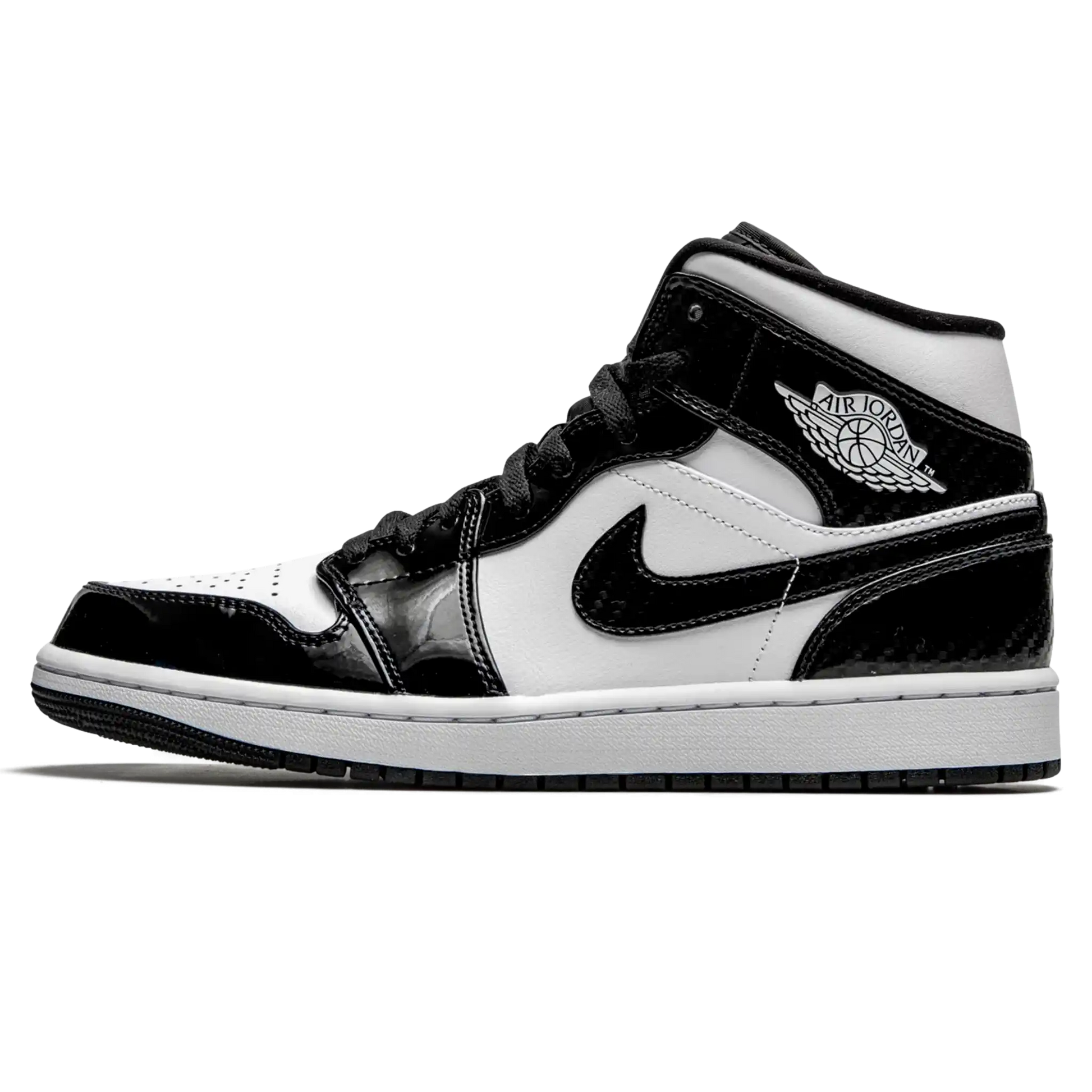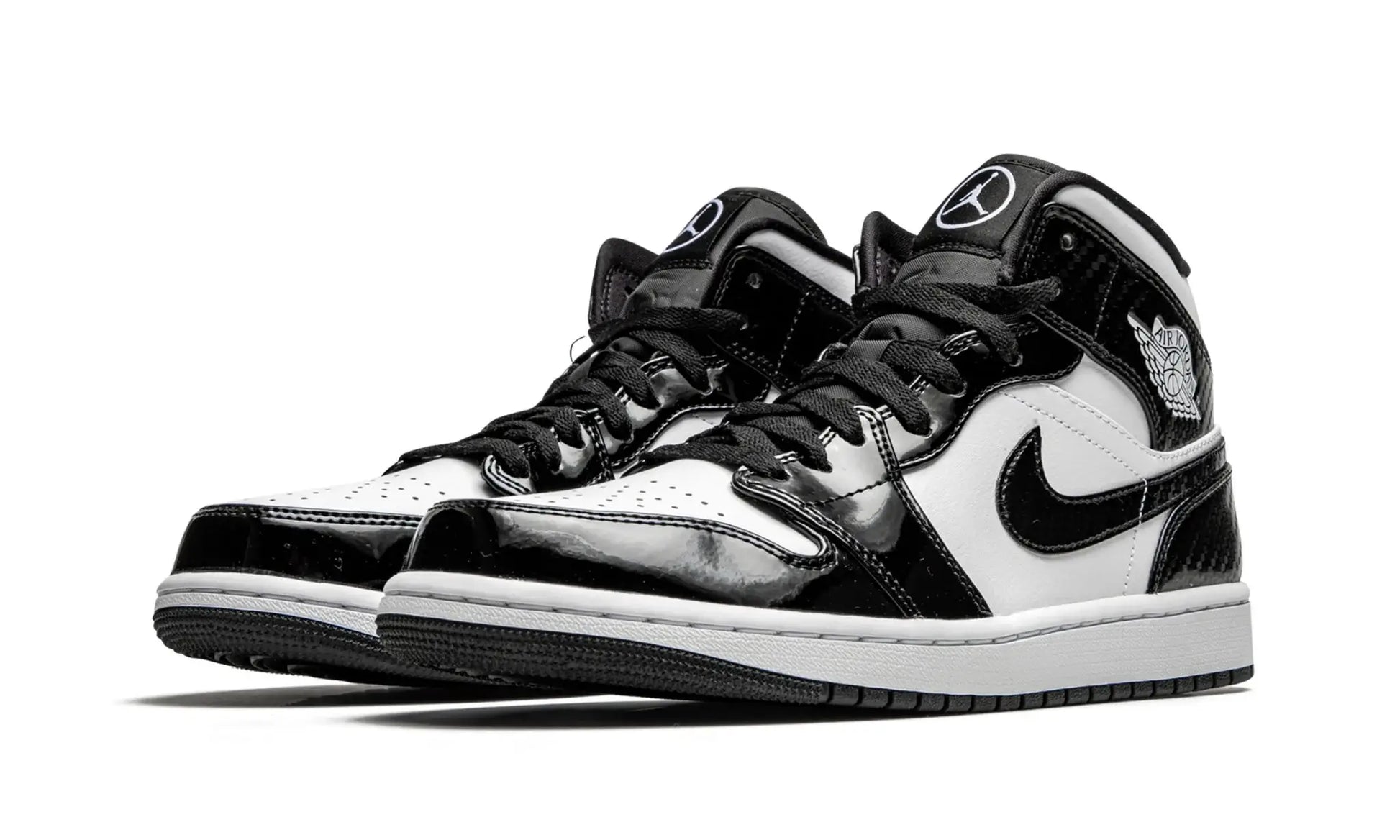 O Air Jordan 1 Mid "Carbon Fiber" Preto / Branco celebra o evento de meio de temporada da NBA com um design brilhante. Este modelo de cano médio possui um cabedal composto por couro branco e sobreposições contrastantes em couro envernizado que imita os painéis de fibra de carbono. O logotipo Wings no lado lateral é branco, enquanto um ícone do Jumpman circulado adorna a etiqueta da língua. Com um design clean em preto e branco, a entressola é branca e a sola de borracha clássica dos Air Jordans é preta.
