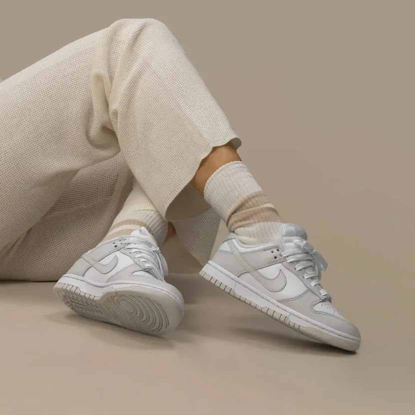 O Nike Dunk Low "Photon Dust" oferece uma colorway altamente versátil para as mulheres, destacando-se pela simplicidade e elegância. Lançado em abril de 2021, este Dunk utiliza uma combinação de couro branco na base e couro Photon Dust em áreas estratégicas, como antepé, ilhós, colarinho e Swoosh. O design minimalista é acentuado pelo branding "Nike" bordado no calcanhar e pela etiqueta de língua "Nike Air" em branco. A parte inferior apresenta uma entressola de borracha branca e uma sola externa cinza claro, garantindo um visual descontraído.