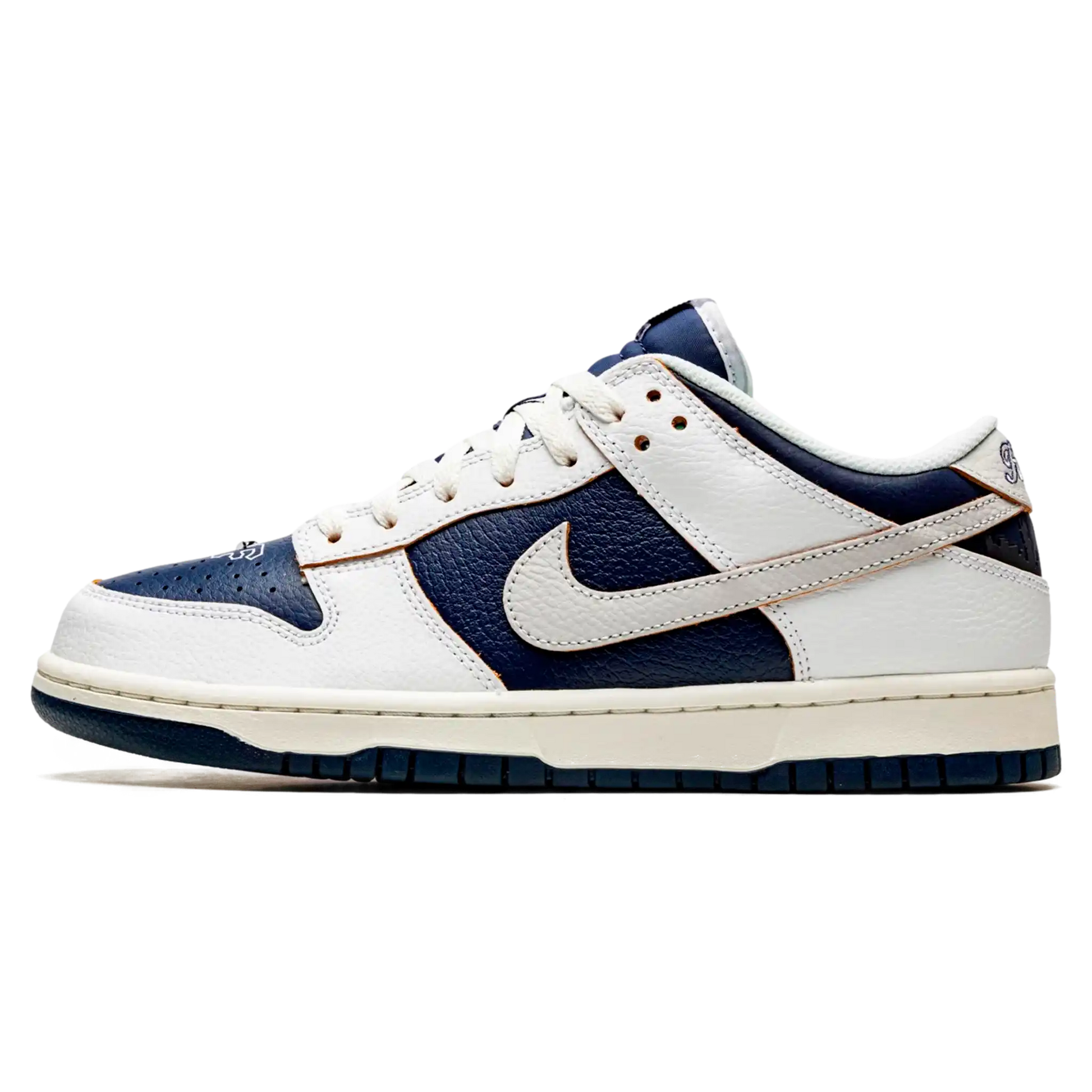O HUF x Nike Dunk Low SB 'New York' celebra o 20º aniversário da marca de streetwear HUF, fundada por Keith Hufnagel. Este par presta homenagem às raízes nova-iorquinas do falecido skatista profissional, apresentando um cabedal de couro amaciado em tons de azul-marinho e sobreposições brancas. O Swoosh na cor off-white adiciona contraste.