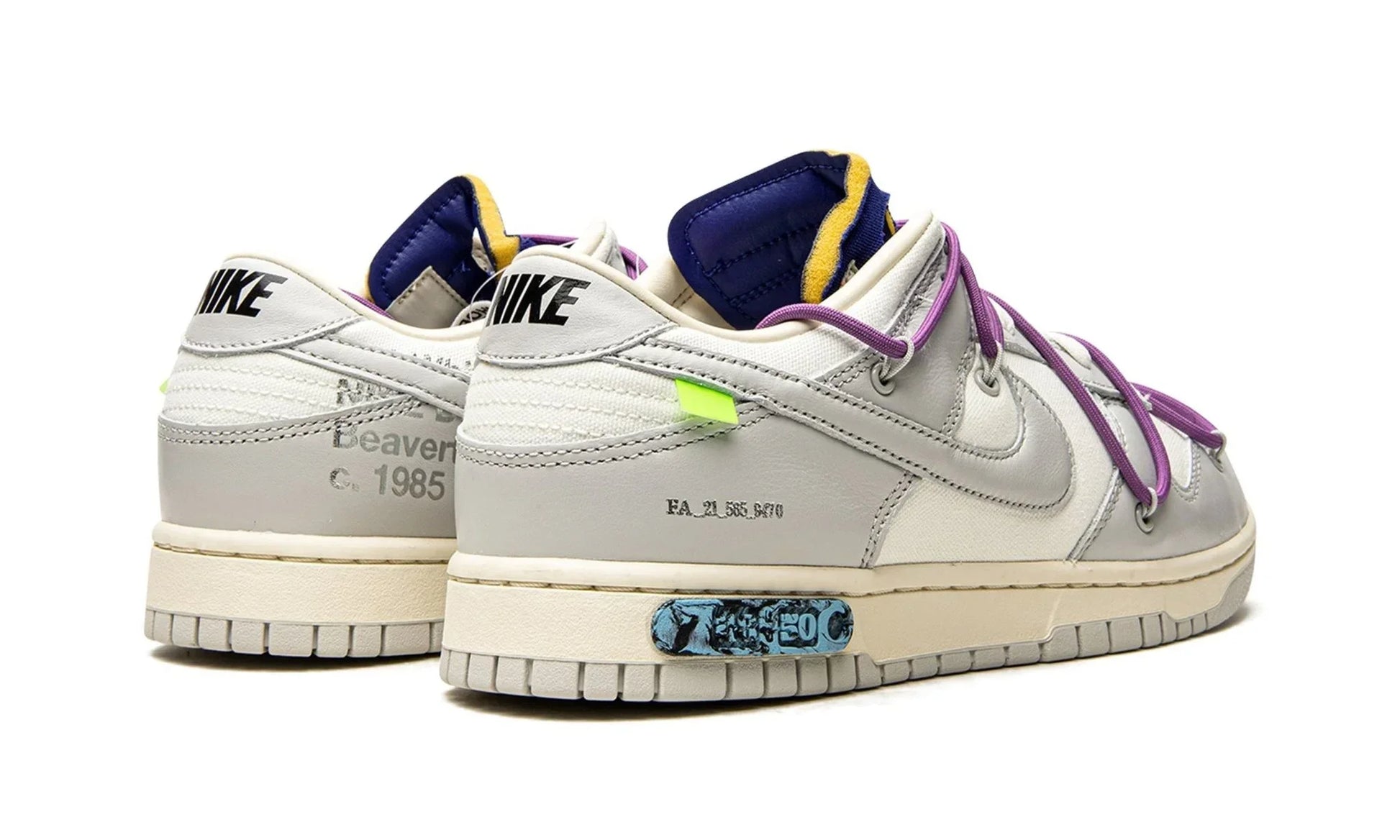 O Nike Dunk Low x Off-White "Lot 48" faz parte da coleção 'Dear Summer', uma extensa continuação da primeira colaboração de Virgil Abloh com o Nike Dunk em 2019. O modelo de cano baixo utiliza um cabedal de couro branco com sobreposições de lona cinza claro, juntamente com os toques distintivos de Virgil Abloh, que incluem um tag de plástico com lacre e texto impresso. Limitado a cinquenta pares, um distintivo '48 of 50' é fixado na lateral da entressola.